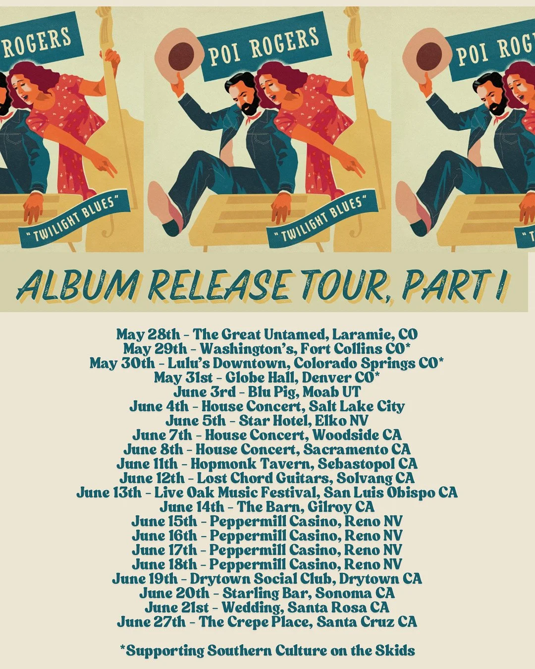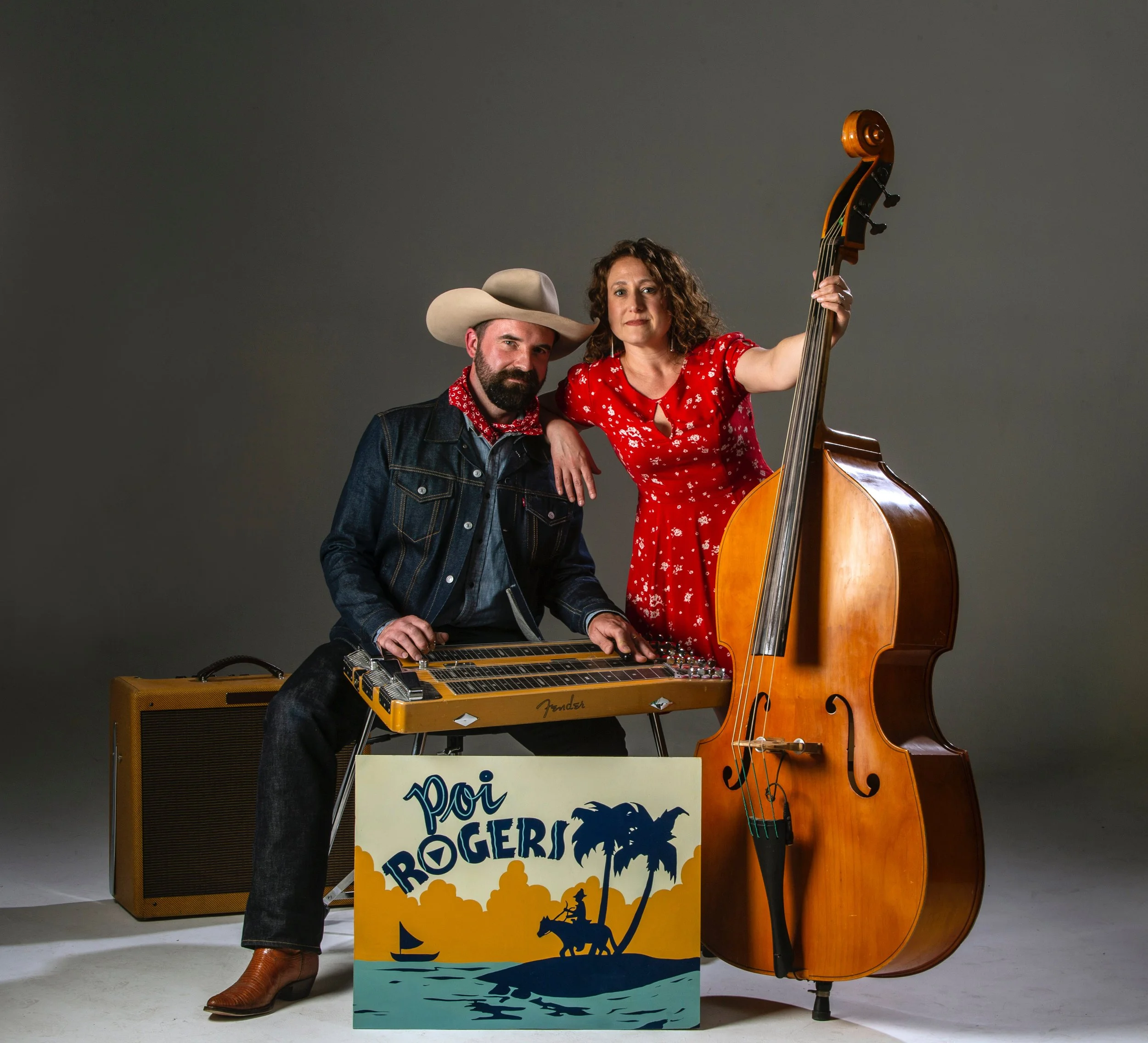 What began as a fun way for the couple to explore the vintage musical styles they love turned into an in-demand touring act, with Poi Rogers ‘accidentally’ playing almost 300 shows since 2023. Their debut album, Twilight Blues, released in June of 2025, is a collection of eight songs that are both cinematic snapshots from Gerard and Carolyn’s life together and witty odes to their antiquated passions.